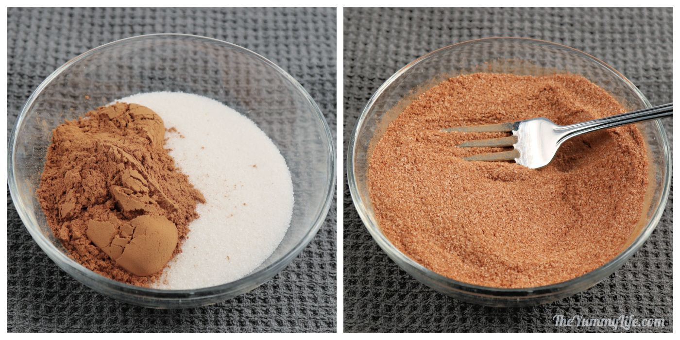 Step 9. Combine the sugar and cinnamon in a small bowl. Stir to evenly mix.